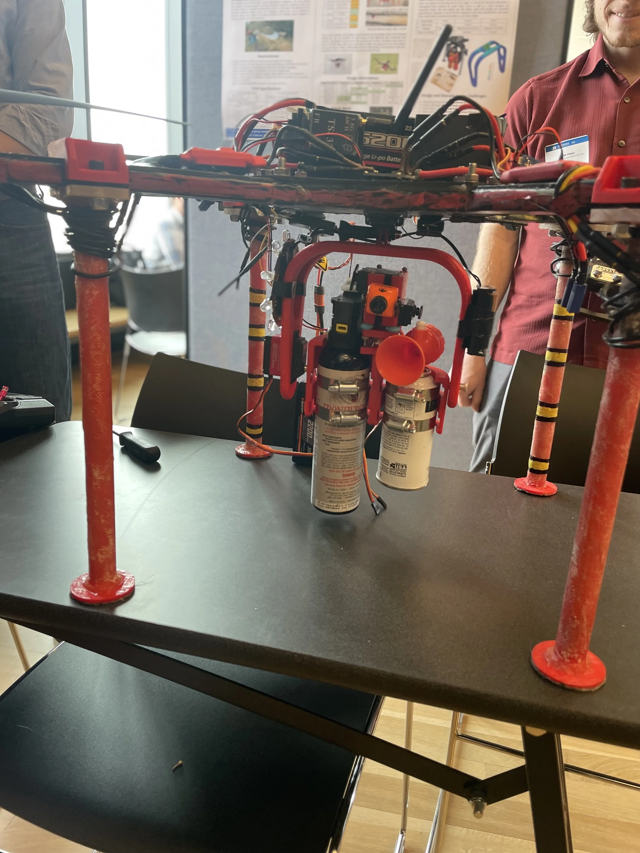 The second part of the team designed the drone that would carry the camera and deterrents. The drone needed to be stable enough to carry a fairly heavy payload of bear spray, an airhorn, and lights across considerable distances. The team struggled with electronic components of the drone and managing the payload, but the toughest challenge to overcome was integrating the flight controller software. Using an MSU drone, the team created a working prototype that is able to fly, record video, and spray bear spray!