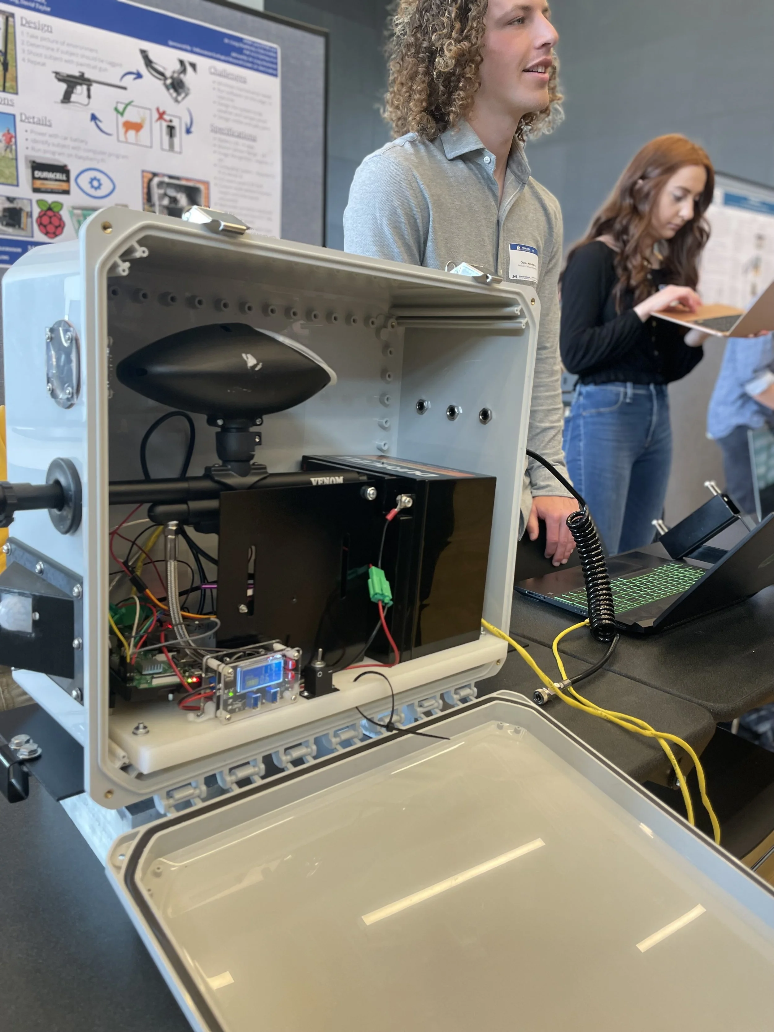 The group finished with a working prototype after hard work overcoming design challenges. The biggest issues were related to implementing software that recorded the data and recognized the shape of the target species. Additionally, the group needed to experiment with various paint mixtures that could successfully mark an animal, but also be non-toxic.